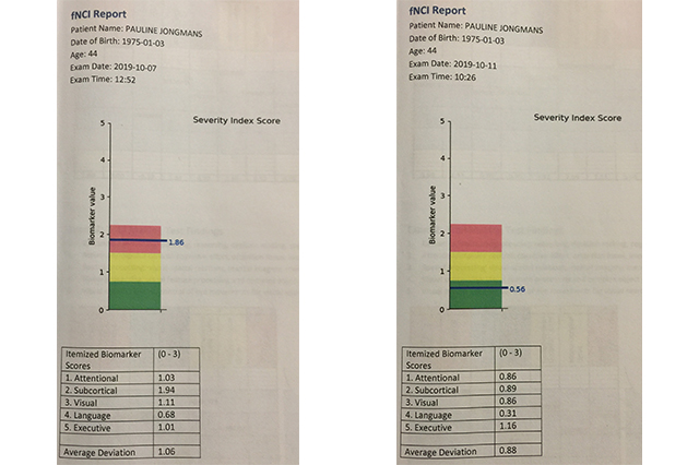 Naast de ‘grove’ scores worden er ook ca. 45 specifieke hersengebieden in kaart gebracht. Zijn ze in balans of krijgen ze teveel (overactief) of te weinig( in actief) bloed en dus zuurstof. Alle gebieden die bij mij zwaar in de min stonden waren opgeschoven richting het midden. Nog niet alles op de juiste plaats maar zeker aan de wandel op de goede route. Sommige gebieden waren extra en dus te actief geworden maar er werd ons verzekerd dat dit logisch was. Door het trainen van de zwakke gebieden waren de over actieve gebieden ook meer aangesproken. Iets wat in de loop van de tijd zich moest settelen en wat dus nog zal verbeteren. Bij mensen met klachten door een hersenschudding en whiplash is er nog veel verbetering in de 6 weken na therapie, in mijn geval kunnen ze geen uitspraak doen over de termijn waarop dit zal verbeteren en dit volgen ze dan ook vanaf afstand.