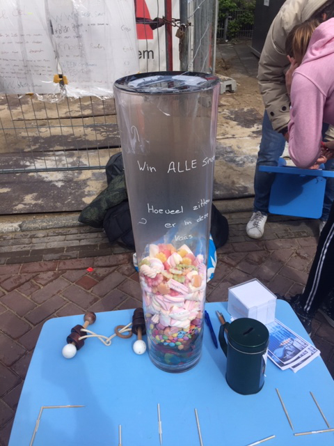 Zo hadden ze een brein breker puzzel bij zich waarbij een ring van twee in elkaar gedraaide touwtjes af gehaald moest worden. Kon iedereen een knuffel of een compliment krijgen bij een bijdrage en een vaas vol snoep. Iedereen kon voor €0,50 raden hoeveel snoepjes erin zaten en de hele inhoud winnen.