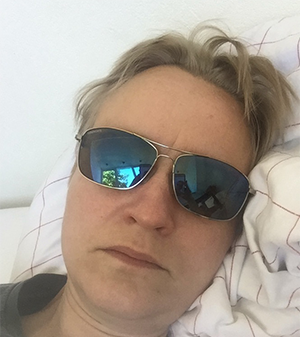 Gelukkig heb ik dan Gert naast mij, die herkend wat er aan de hand is en mij helpt een pas op de plaatst te maken. Alles aan communicatie even stil te leggen en bij te komen. Zoals je ziet op de foto’s gaat dat in vol tenue. In huis, gordijnen dicht, koptelefoon en zonnebril op en plat.
